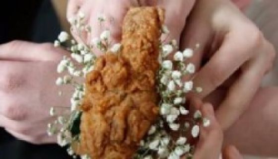 No, seriously. KFC has whipped up a corsage made of a drumstick and baby breath flowers. In the promo video, they say “Love can be awkward. Make it less awkward by surprising your date with a corsage that will make her eyes light up and her mouth water.”